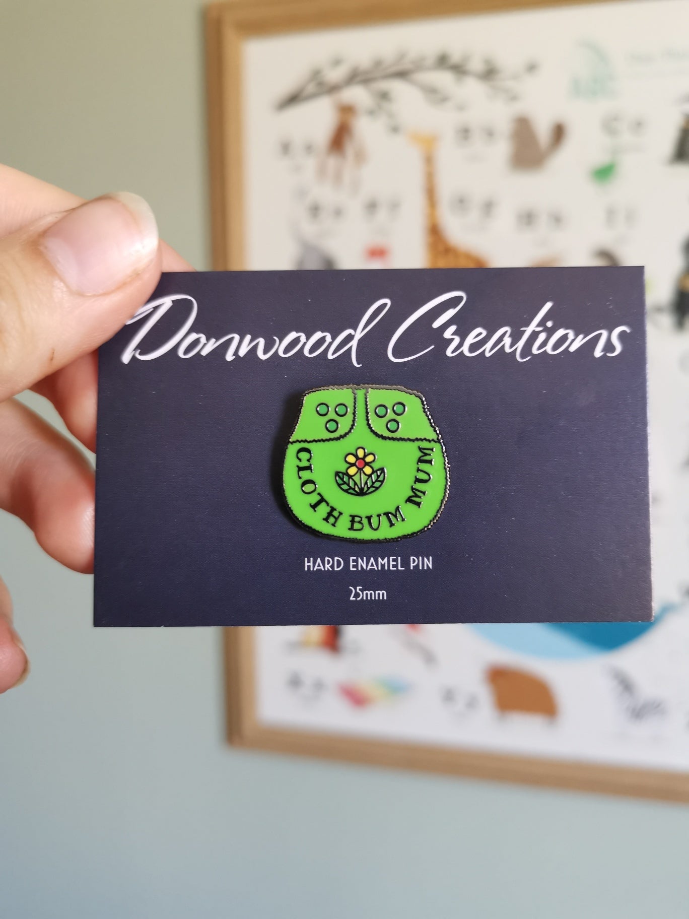 Cloth Bum Mum Pin Badge by Donwood Creations