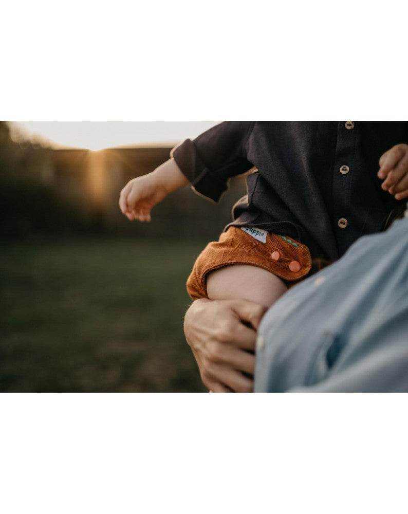 Puppi one-size covers are made of two layers of extremely soft and thin wool. Colorful snaps and decorative stitching make this nappy a conversation piece. The leg elastics are soft yet very stretchy, which allows for a trim fit on virtually every child. Once lanolised, these covers hold moisture very effectively. Wool is an extremely versatile fabric for cloth diapering-- it is breathable, temperature regulating (perfect for both cold and hot days), soft, and naturally antibacterial. Lanolin breaks down urine into salts and water, so it does not need to be washed as often as PUL diapers. Simply hang to dry between uses. However, a special washing and re-lanolising procedure is necessary on wash day.