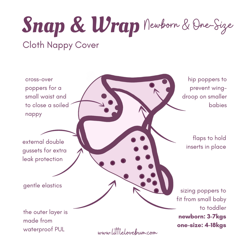 The Snap & Wrap Newborn is a versatile and simple nappy system. Use with your favourite nappy inserts to suit your babies needs. Simply lay in or snap on your preferred insert or use over a fitted, flat or pre-fold nappy.