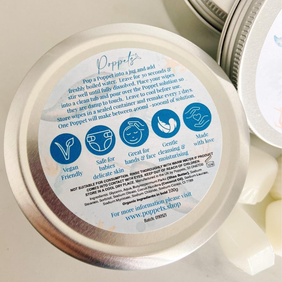 Pop a Poppet into a jug and add freshly boiled water. Leave for 30 seconds and stir well until fully dissolved. Place clean dry wipes into a heat safe tub and pour over the Poppet solution. Leave to cool before use. Store wipes in a suitable container and re-make every 2 days. One Poppet will make between 400ml-1000ml of solution.