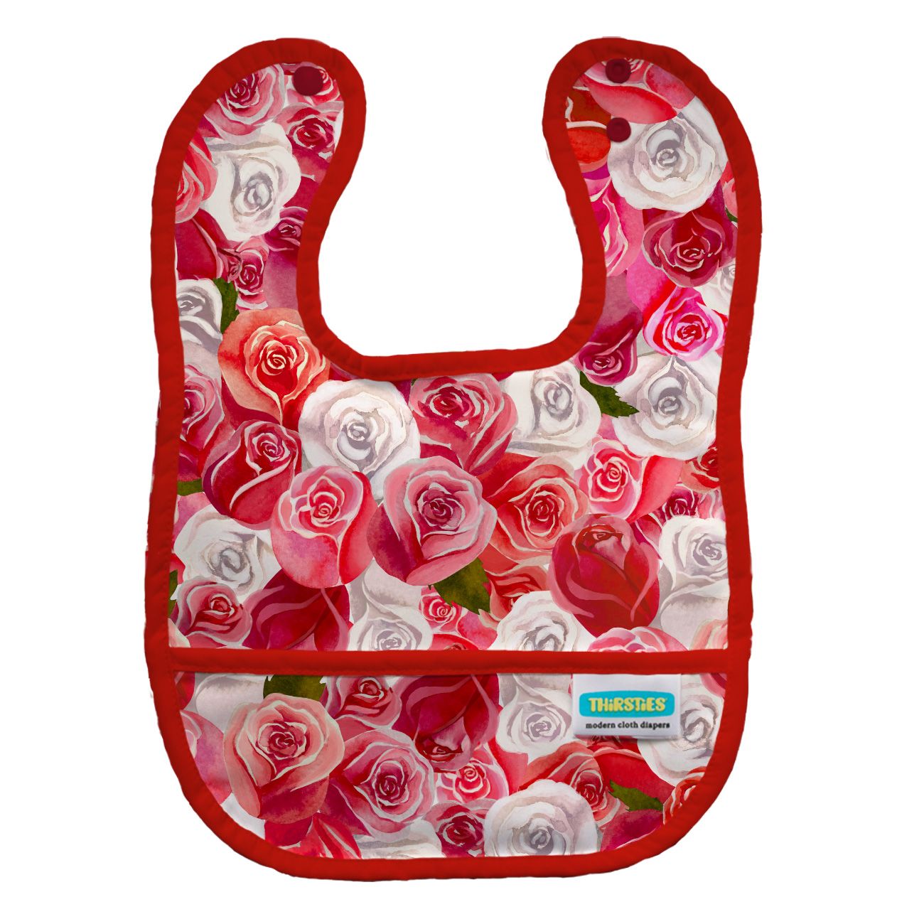 Thirsties Pocket Bib is made with waterproof PUL, backed with white mesh, and trimmed with matching binding.